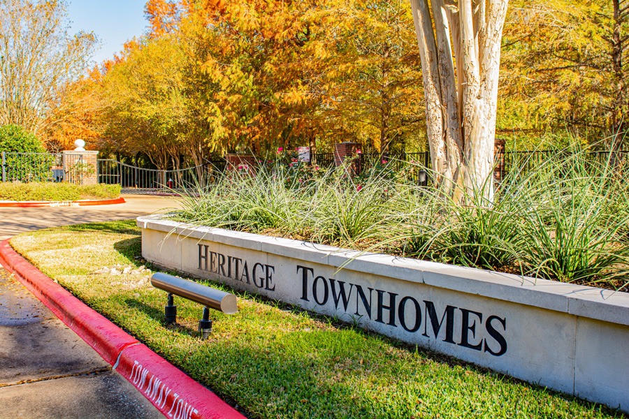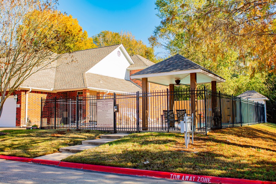 Heritage Townhomes is a well-maintained, gated community located in College Station, Texas, known for its beautiful homes and friendly atmosphere. Amenities include a community pool for residents to enjoy.